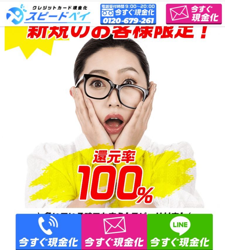 スピードペイは、初回利用者に対して還元率最大100%を提供するクレジットカード現金化業者です。